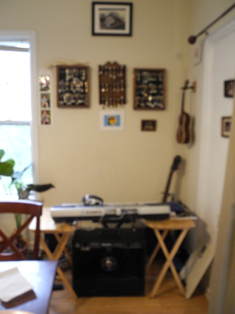 Sure, it’s just a corner of our dining room which is a corner of our living room, but it’s home! Actually, I don’t really sit back there much. It’s mostly a fort to protect my guitar from kids. Casio LK-46 on top there over the Peavey. Grammy’s spoon collection on the wall. Art by Travis Cohn above and FRANCO below.